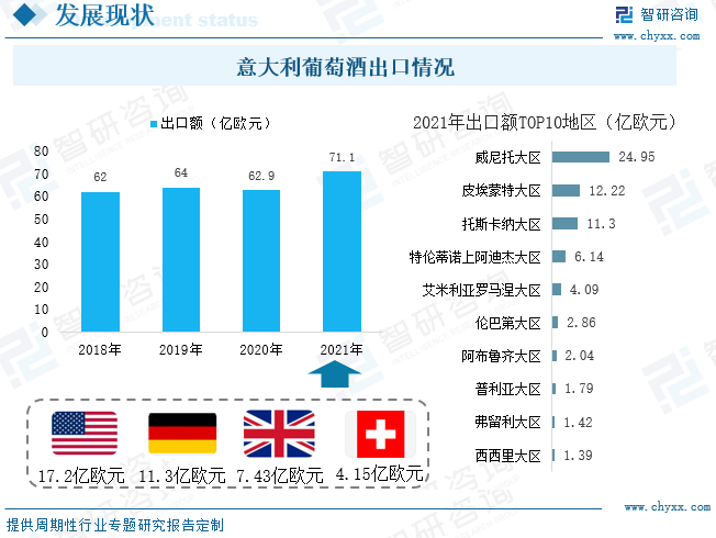 意大利凭借酿酒历史悠久、葡萄酒产品品质高、口感丰富等优势,在国际市场上备受青睐,出口规模位列全球前列,在2020年疫情影响下,出口规模仍达62.9亿欧元,2021年出口额增加至71.1亿欧元,其中DOP级别葡萄酒贡献了出口总额的2/3,也是增幅最大的葡萄酒品类,较上年同比增长15.8%;IGP级别葡萄酒及其他类型葡萄酒出口额分别增长了5.4%、8.9%。其中出口目的地前四地区为美国、德国、英国和瑞士。