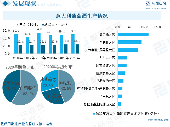 意大利为全球最大的葡萄酒生产地,也是全世界最早的葡萄酿酒国家之一。意大利作为一个半岛,南北呈细长形状,纬度跨度非常大,自然环境丰富多样,丰富的高山丘陵为葡萄种植提供了土壤条件。此外,意大利的地中海气候也十分有利于葡萄的种植,葡萄酒产区多达20个。2021年,意大利的葡萄采收季从8月中旬起一直持续到了11月,葡萄品质较好,为葡萄酒生产提供了丰富的原料。2020年意大利葡萄酒产量为49.1亿升,主要以白葡萄酒为主,按体系等级来看,DOP级别占比较大。2021年产量为50.2亿升,产量主要来源于威尼托大区、普利亚大区、艾米利亚-罗马涅大区等地区。