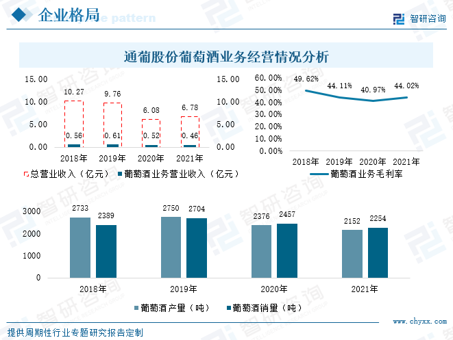 从经营情况来看,葡萄酒业务占公司总营收比重并不大。2021年公司葡萄酒业务营业收入为0.46亿元,延续2020年下降走势,毛利率维持在40%以上;2021年公司产能为1万吨/年,产量为2152吨,销量为2254吨,较2020年均有所下滑