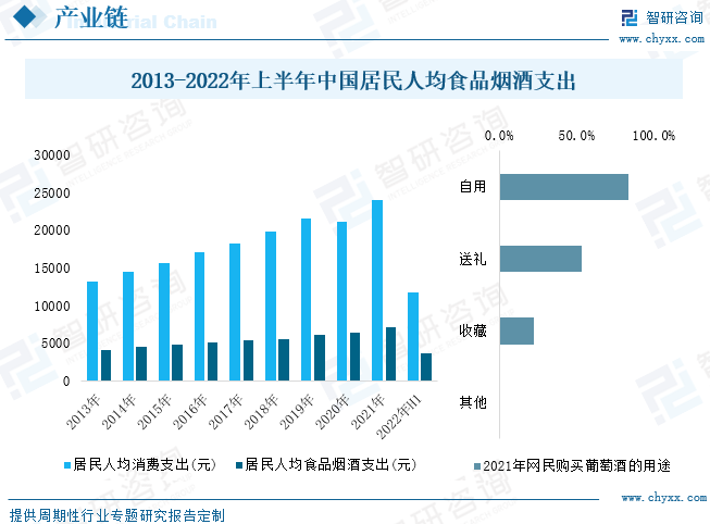 随着中国经济的发展,居民人均可支配收入不断上涨,消费水不断提升,人均消费支出由2013年的13220元提升至2021年的24100元,其中占比最大的为食品酒支出;2022年上半年中国居民人均食品酒消费支出3685元,增长4.2%。随着居民消费水的不断提高,葡萄酒逐渐成为许多消费者的购物清单中不可或缺的商品。同时从购买葡萄酒用途分布来看,葡萄酒的礼物消费属减弱,逐渐转变为消费者日常消费品类。