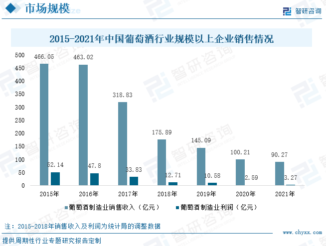随着我国葡萄酒需求量不断减少,国产葡萄酒企业正面临着巨大的挑战,规模以上企业销售收入不断下滑,从2015年的466.05亿元下滑至2021年的90.27亿元,利润也处于大幅下跌的状态,2021年利润仅为3.27亿元。绝大部分葡萄酒生产经营企业经营困难,在2021年116家规模以上葡萄酒企业中,亏损企业达28个,企业亏损面为24.14%,亏损企业累计亏损额2.87亿元,行业总体仍处于亏损边缘。