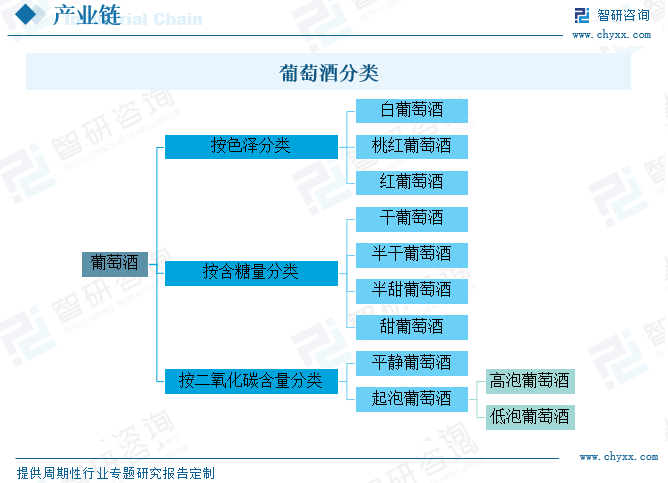 1、产业链图谱:葡萄酒可按色泽、含糖量等方面来进行分类