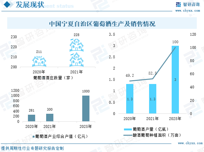 宁夏地区凭借优越的自然地理环境、生产要素成本较低等优势为我国葡萄酒发展重点地区之一。年来,宁夏葡萄酒产业迅猛发展,2021年酿酒葡萄种植面积为52.5万亩,产量约为1.3亿瓶,综合产值突破300亿元。已初步形成了贺兰县金山、西夏区镇北堡、永宁县玉泉营、青铜峡市甘城子及鸽子山、红寺堡区肖家窑等酒庄集群,成为全国葡萄酒庄最集中的产区。其中贺兰山东麓葡萄酒驰名中内外,已远销40多个国家和地区,2021年宁夏贺兰山东麓葡萄酒品牌价值281.44亿元。