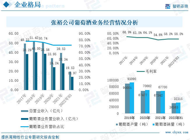 从经营情况来看,葡萄酒一直是公司最主要的营收来源,经营模式主要以经销为主,截止2022年上半年,公司共有4846家经销商。2020年受疫情影响,公司葡萄酒营收大幅下滑,2021年在市场消费环境整体有所好转下,公司葡萄酒业务营收有所回升,2022年上半年继续回暖,同比增长6.8%。公司葡萄酒业务盈利较强,毛利率保持在50%以上。从产销量来看,走势与行业整体态势保持一致,不断下滑,由此可见公司销售产品逐步迈向中高端化,2022年上半年产销量有所增长。