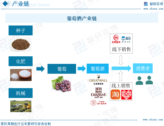 产业链上游主要为葡萄种植生产所需要的种子、化肥、机械等,下游则为消费者,可通过线上、线下销售渠道进行购买。