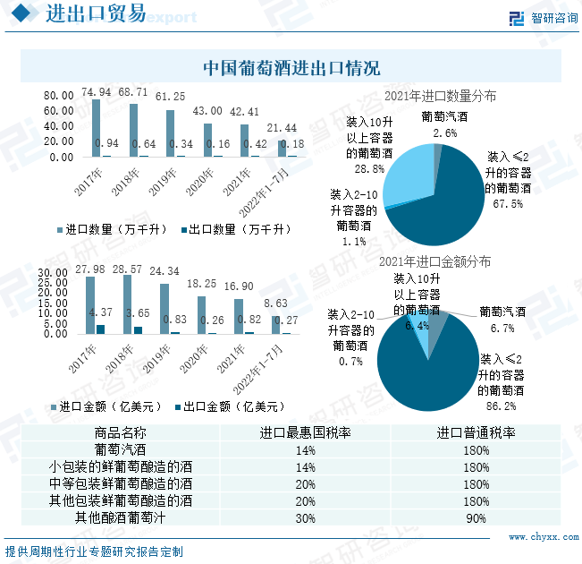 自2001年中国加入WTO后,进口葡萄酒关税从63%一路下降至14%,新西兰、智利等国家还逐步实现零关税,进口葡萄酒成本逐渐降低,价格优势愈发明显。同时随着中国消费能力不断提升,中国成为葡萄酒主要消费市场之一,相较于国产产品,消费者更青睐于进口葡萄酒,两年进口数量甚至于超过国产产量;但疫情发生以来,葡萄酒消费市场持续低迷,导致进口数量也不断下降。在2020年进口数量同比下滑29.8%,2021年虽延续下降态势,但降幅有所收窄。2022年1-7月,由于上海、北京等葡萄酒主要消费地爆发较大规模疫情,导致进口数量再次大幅下滑15.4%;进口产品主要为小容器的葡萄酒。在出口方面,我国葡萄酒出口规模非常小,在国际市场中,竞争力较薄弱。
