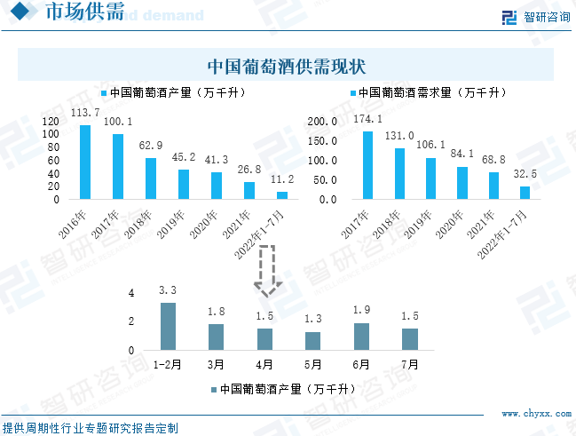 目前,我国国内仍未能形成浓厚的葡萄酒消费氛围,大多数消费者尚未养成经常饮用葡萄酒的惯,导致行业抵抗风险能力偏弱。两年来,在疫情和烈酒的冲击下,我国葡萄酒需求量大幅下滑,到2022年1-7月葡萄酒表观需求量仅为32.5万千升。