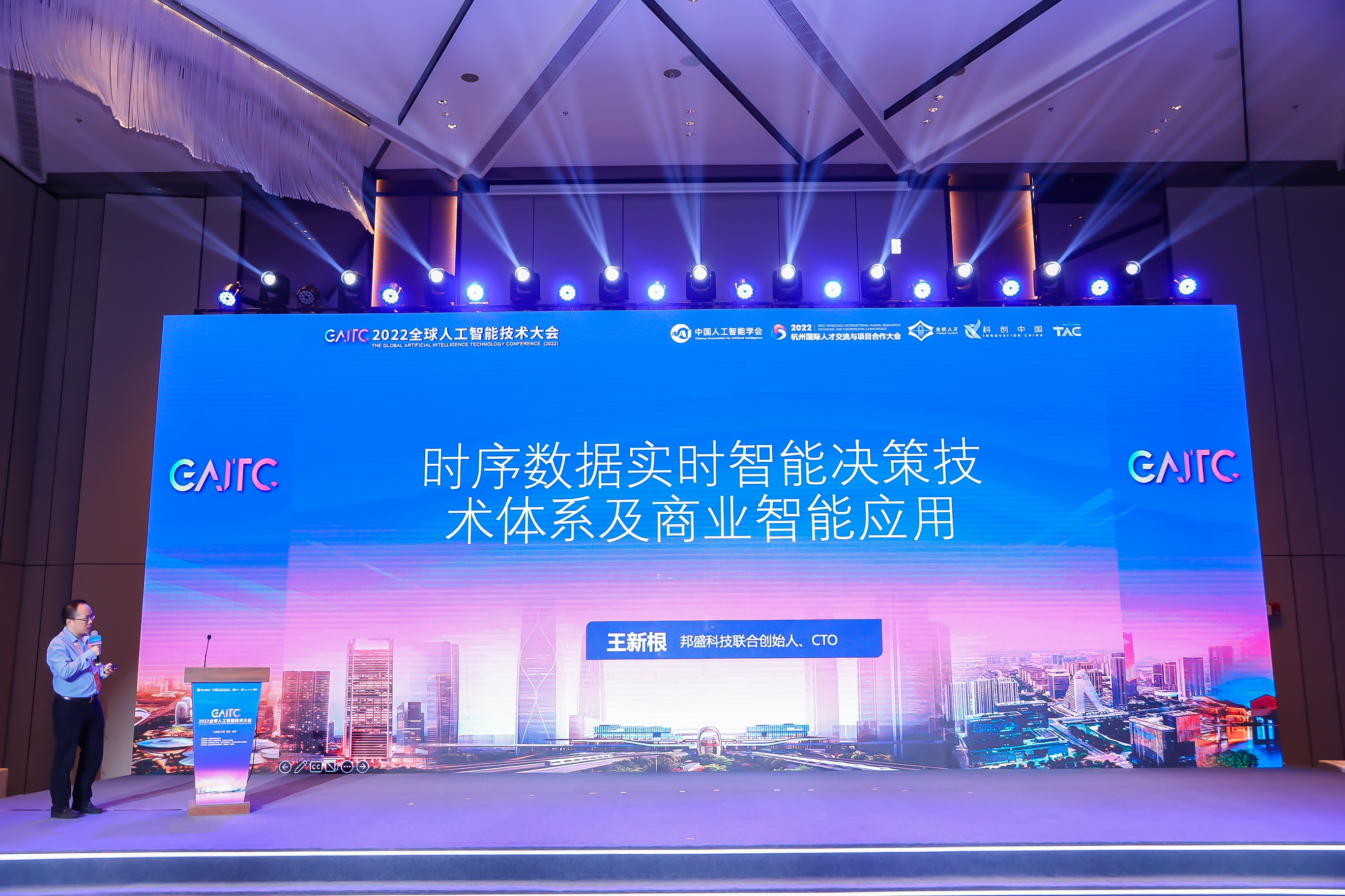 会上,邦盛科技联合创始人、CTO王新根博士应邀出席,并发表“时序数据实时智能决策技术体系及商业智能应用”主题演讲。在大会主论坛尖峰对话环节,中国工程院陈纯院士与5位院士聚焦人工智能与元宇宙进行了主题探讨。