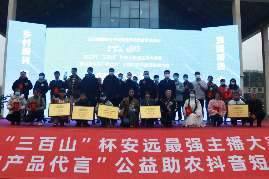 乡村振兴的关键是产业振兴,产业振兴的落点是产品振兴。为进一步推进国家电子商务进农村综合示范县创建工作,深化“赣品网上行”、“十百千万”促产业转型和助消费升级,助力产品振兴。12月14日下午,2022年“三百山”杯安远最强主播大赛暨“我为家乡农产品代言”公益助农抖音短视频大赛颁奖典礼在江西赣州安远县电商产业园举行。