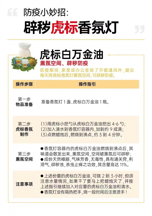 现在广东,很多家庭都在使用一种更便捷的居家辟秽方法:就是使用虎标白万金油香氛灯,或用其它器皿加热虎标白万金油,熏氛房子,可以清凉辟秽。只需挖取适量的虎标白万金油放入香氛灯或者其他加热器皿,加上少许清水后,点上蜡烛,就能安享一片洁净的空间。熏氛后的房子,弥漫着清新的薄荷味道,其成分里的樟脑,可以芳香通窍,清凉辟秽。虎标白万金油的成分为草本提取,使用时,也不用担心家里的老人、小孩、鼻炎患者会过敏或者不舒服。