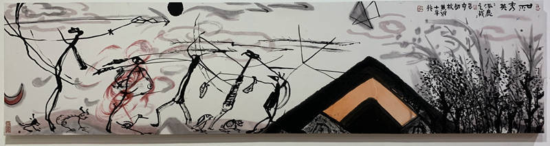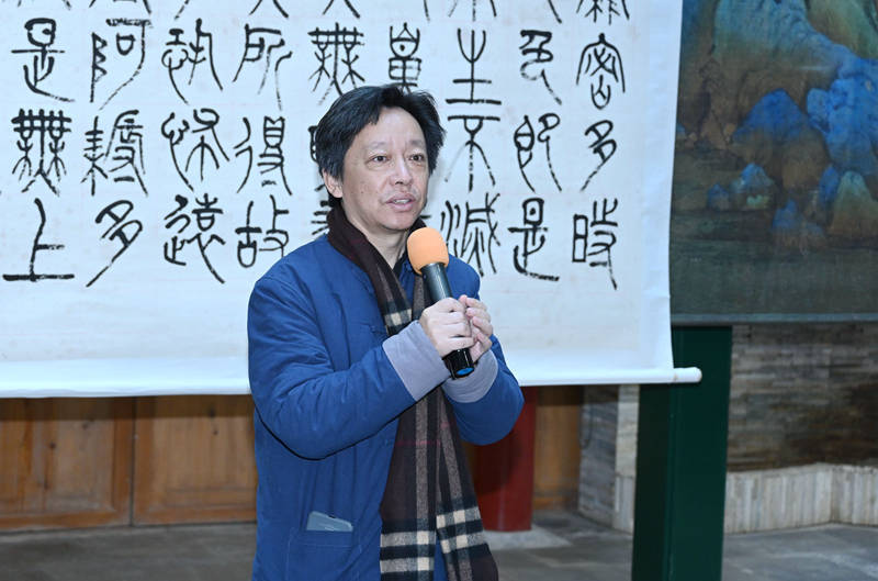 光明日报出版社副社长、书画家王林向画家甘雨赠送画作《遇兔呈祥》,表达新年祝福,并发言表示,此次画展别开生面,作为在黄河岸边长大的他非常关注甘雨、爱若的黄河之行,艺术家在黄河源头及沿岸艰辛考察,并用诗歌、书画呈现伟大母亲河的作品令人震撼。