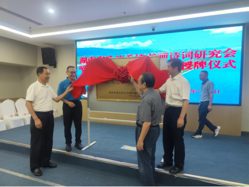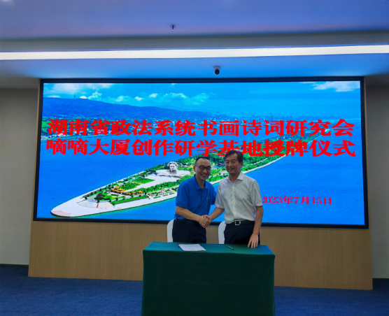 仪式现场,陈岭主席与湖南嘀嘀大酒店董事长喻熟东签约,标志着“湖南省政法文化嘀嘀大厦创研基地”正式成立。随后,在众位嘉宾的共同见证下,彭对喜、刘庆富、陈岭、喻熟东为创作研学基地揭牌。