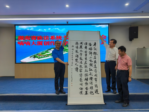 诗以言志,文以化人。以法护商,以商促文。7月15日上午,坐落于长沙市芙蓉区“中央文化区”的嘀嘀大厦五楼会议室高朋满座,热闹非凡。“湖南省政法文化嘀嘀大厦创研基地”签约暨挂牌仪式在此隆重举行。省政法系统书画诗词研究会主席团成员彭对喜,副会长刘庆富;诗词分会主席陈岭及副主席贺曦、周加良、江世炎;书法分会主席陈祥松、副主席吴若顺;长沙法官文联副主席胡军军等领导和嘉宾出席活动。