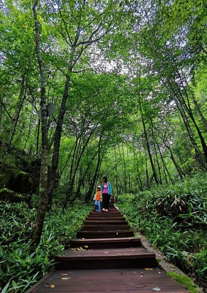 2、山上林木茂密,植被覆盖率高达98%,素有 “绿色王国” 和“天然氧吧”之称,负氧离子含量高达50000个/cm³,有净化空气和清肺之效。