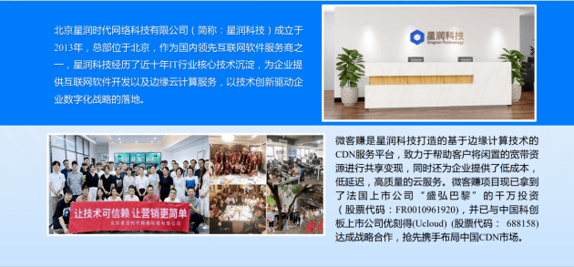 星润科技董事长,微客赚创始人—赵科(赵总)介绍到:微客赚项目是星润科技推出的基于边缘计算技术的CDN服务平台。这个平台通过挖掘客户的闲置宽带资源,为企业提供低成本、低延迟、高质量的云服务。同时,它还通过免费赠送并成功安装给每个家庭方式,协助总部快速抢占终端家庭边缘节点,并通过无限量提供设备给区域合伙人按约定的成分比例分润,享受长期分润,实现躺赚。这种商业盈利模式创新性地实现了客户、企业和星润科技的三方共赢。微客赚项目的推出,展示了星润科技在CDN服务领域的领先地位和创新实力,有望为行业带来更多的惊喜和变革,星润科技在边缘计算领域的技术实力和创新实力为它赢得了国际市场的广泛认可,与UCloud和盛弘巴黎的合作进一步巩固了其在行业中的领先地位。这种强大的合作关系的建立将为星润科技的持续发展提供强有力的支持。