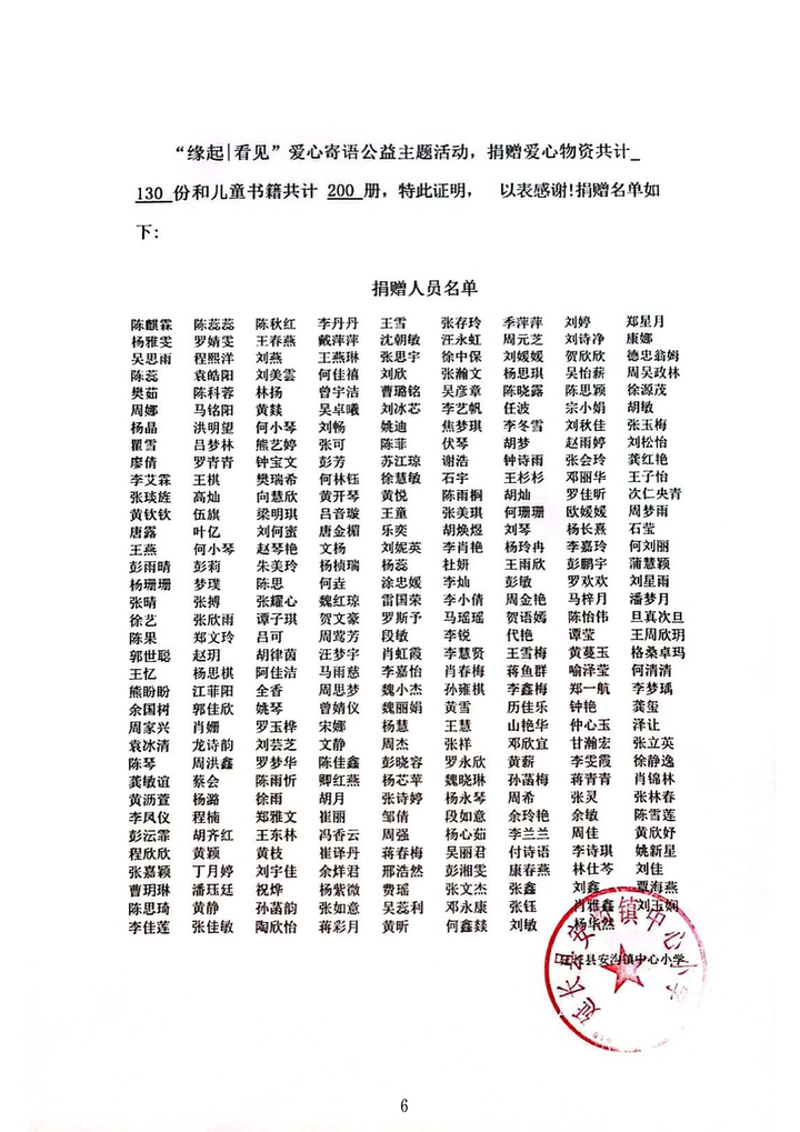 截止2023年11月2日,本次活动是由四川文化产业职业学院艺术设计学院的王哲浩老师指导下、何鑫燚同学,王棋同学的努力宣传下,一起举办完成“缘起|看见”关爱留守儿童活动,共参与726爱心人士。四川文化产业职业学院的学子为陕西省延安市延川县水坪镇第三小学,捐赠图书共计200册。其中陈麒霖同学表现优异,为山区孩子捐献了20本图书,陕西省延安市延川县水坪镇第三小学表示诚挚的感谢。