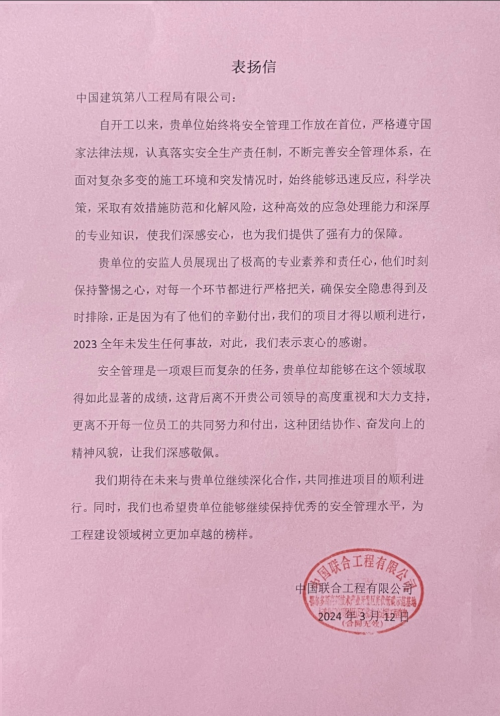 信中指出,自开工以来,项目始终将安全管理工作放在首位,严格遵守国家法律法规,认真落实安全生产责任制,不断完善安全管理体系,未发生一起安全事故。在面对复杂多变的施工环境和突发情况时,始终能够迅速反应、科学决策,采取有效措施防范和化解安全风险。