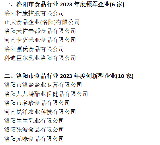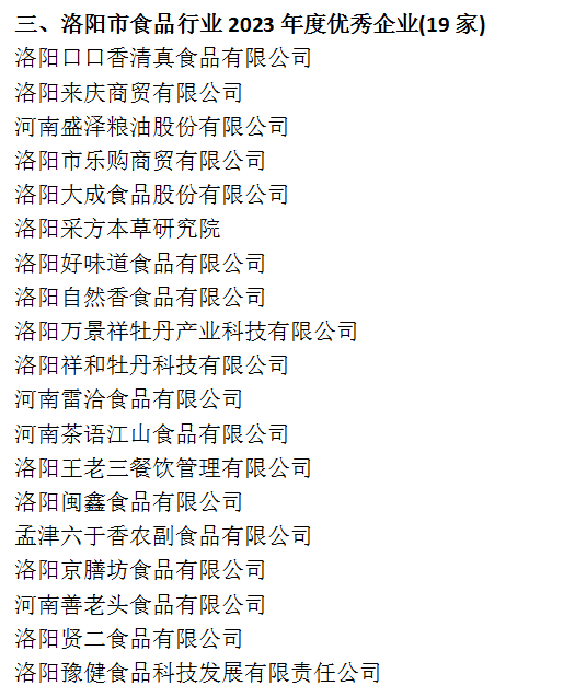 附:2023年度洛阳食品行业领军企业、创新企业和优秀企业名单