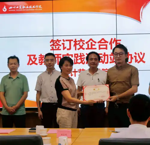 会议中四川工商职业技术学院设计艺术学院为到场企业代表签订校企合作协议,并且为现场企业代表颁发了企业兼职老师、企业专业带头人、企业客座教授证书。