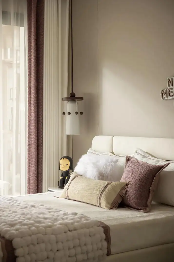 朦胧雾粉色与纯白的碰撞下,一个梦幻、有温度的女孩房逐渐成形。设计师以小小居者喜爱的奈良美智的艺术画为主题,为空间编织出自由追梦的故事线。不止于视觉上的颜色,空间亦投入了情感的色彩,盎然的生命力呼之欲出。