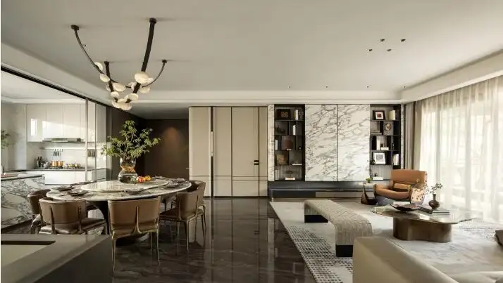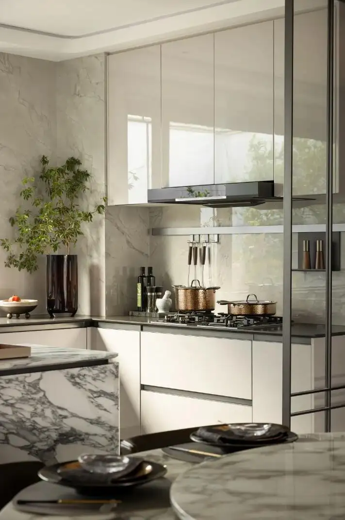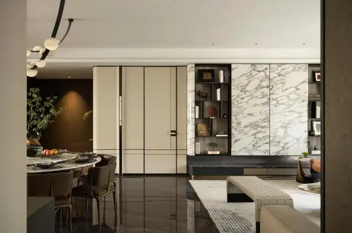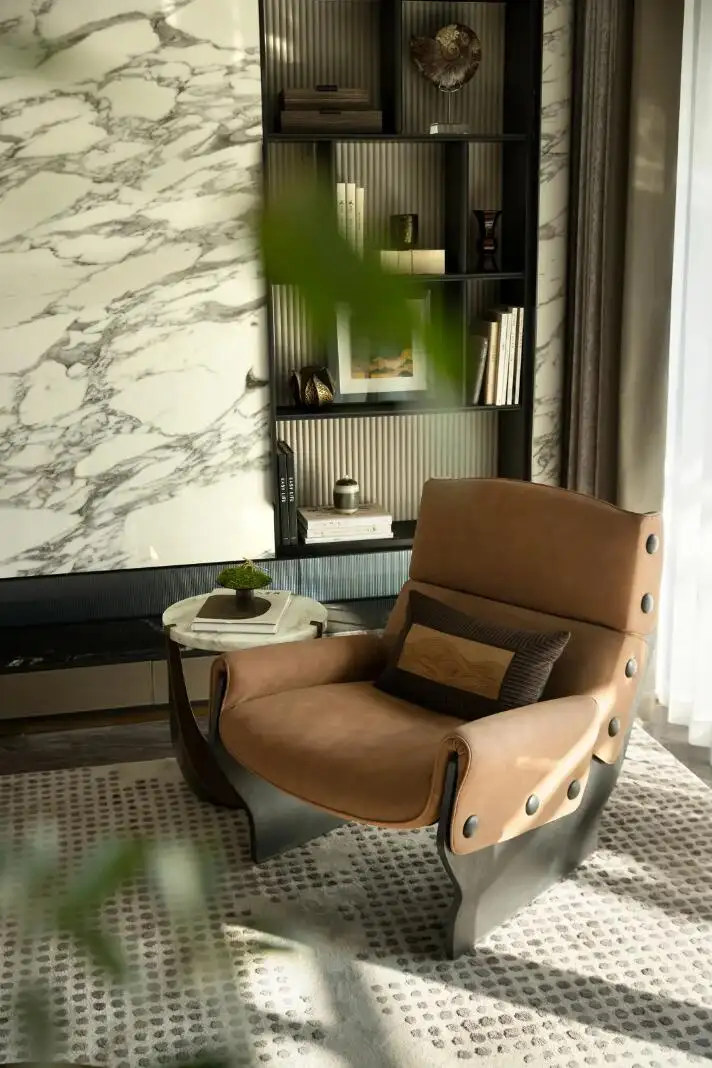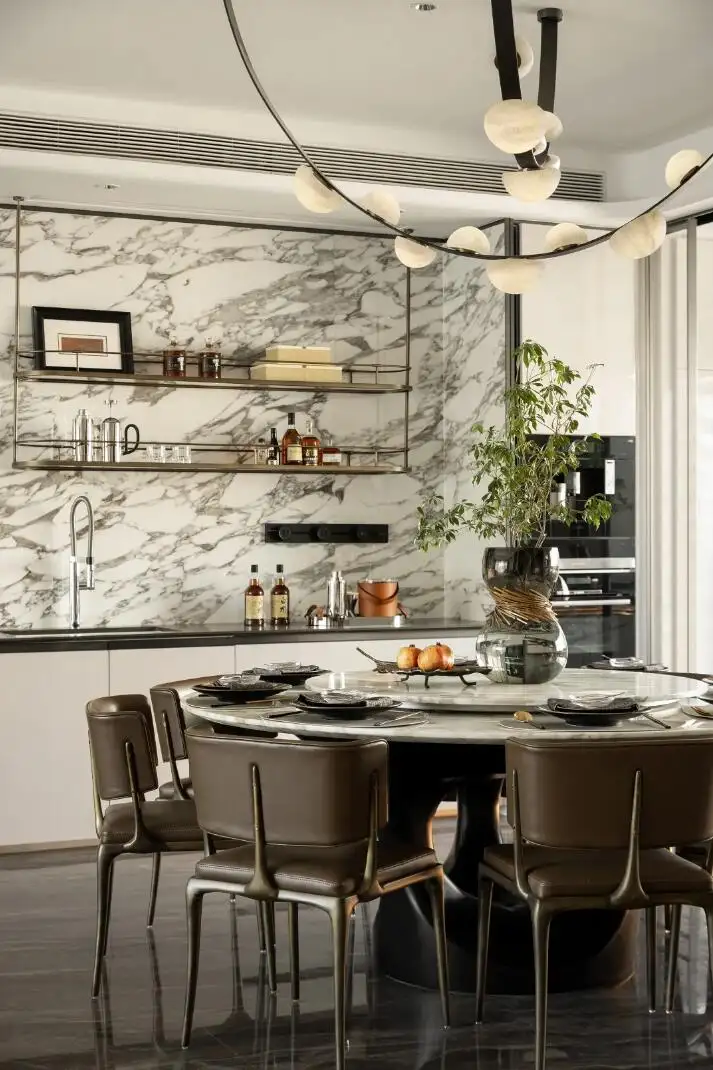 循着物件的美学印迹,视线逐渐从场景本身移转到对未来生活的想象上。铜+云石灯饰形似露珠,颇有自然的气息;精致大理石的脉络里,像是流动着有故事的“墨迹”,东方雅韵与当代合一。当亲朋好友围聚圆桌,慢慢升腾的生活烟火气,足以让人“烹”然心动,一宴一飨,俱是日常。