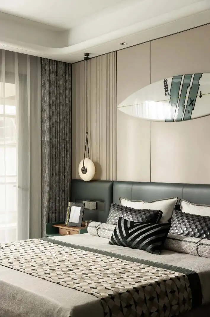 青山入画,墨色入镜。一抹黛绿色,可以品读出摩登、沉稳与复古的味道,渲染出男孩房的气质。正在上大学的居者,是热爱冲浪的运动玩家,亦是黑胶唱片的业余收藏家,设计师据此搭建了一方展示运动与潮玩、艺术与收藏的休闲角,方圆和融。当留声机转动,黑胶唱片里的时光故事,自缱绻乐音里一一浮现,过往奇遇,再次怡人。