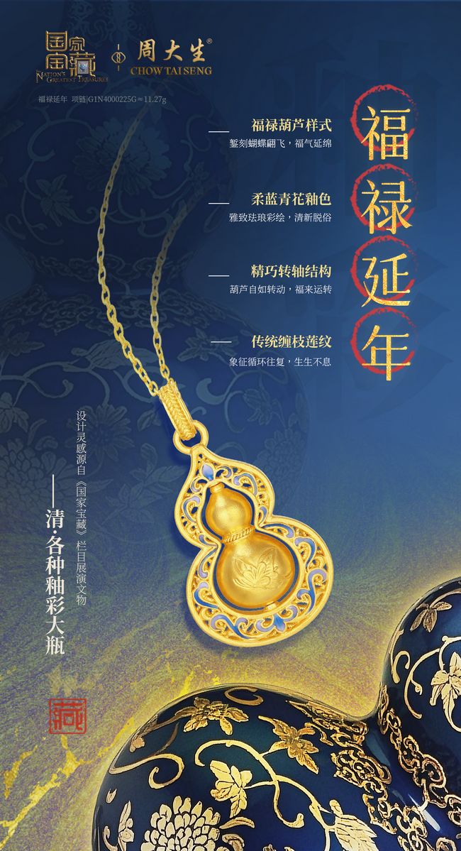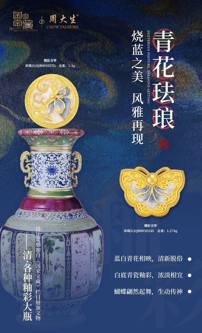 提到中国古代文化的黄金时代,就让人想起一个重要人物——乾隆。作为不折不扣的“文物发烧友”,乾隆一生致力于收藏和开发国宝文物。1748年,他突发奇想,要做一款集历代大成的瓷瓶。经由工匠无数次的精心调试,终于烧制出旷古绝今的各种釉彩大瓶,也为后世留下宝贵的文化遗产。若干年后,各种釉彩大瓶在《国家宝藏》栏目中一经展演便引起广泛关注。其中青花瓷凭借着清雅古典的特点,在各种釉色中脱颖而出,也为周大生提供了设计灵感来源。周大生让各种釉彩大瓶的青花釉色蜕变成青花釉彩珐琅工艺,并运用在国家宝藏系列青花新品中,让黄金首饰更添新中式的时尚韵味,为消费者送上独一无二的典藏金品。