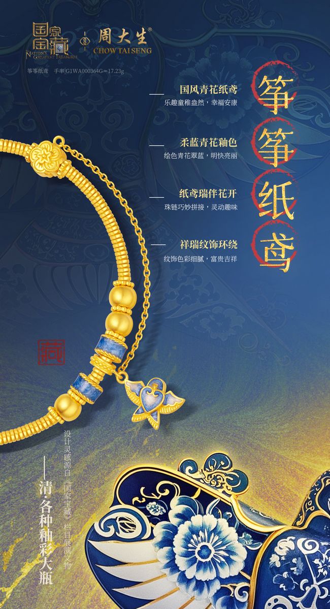 青花染纸鸢,童趣绘美满;釉色融华彩,岁月添清韵。周大生将缠枝花卉和纸鸢等元素相结合,打造兼具典雅和童趣的国家宝藏系列“筝筝纸鸢”产品。在柔蓝色青花釉彩珐琅的点缀下,“筝筝纸鸢”不仅纹饰色彩细腻柔和,且纸鸢形态也栩栩如生,传递着雨后天青,青云直上的吉祥寓意。珠链与缠枝花卉巧妙拼接,明快亮丽且生动趣味,更为“筝筝纸鸢”平添几分东方绝色。