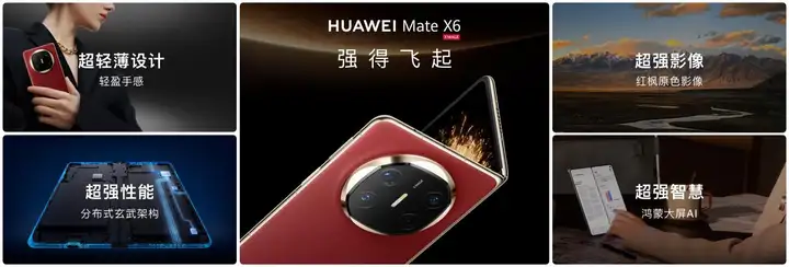 华为Mate X6作为华为在折叠屏手机领域持续研发创新的最新成果,是当之无愧的史上最强折叠屏手机。外观设计上,华为Mate X6延续了华为折叠屏手机的寰宇家族化设计,以行星运行轨道为灵感,匠心打造“寰宇星轨”造型。同时,推出星云灰、星云白两款锦纤材质,以及寰宇红、深海蓝、曜石黑三款超薄素皮机身配色。