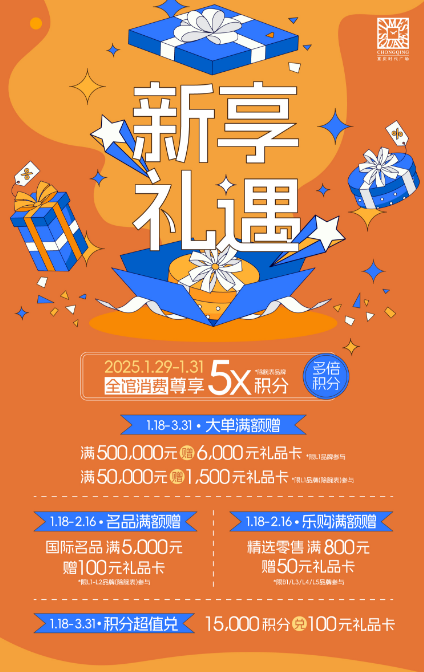活动内容:即日起至2月16日,B1/L3/L4/L5精选零售品牌单张小票满800元赠50元礼品卡,L1/L2国际名品单张小票满5,000元赠100元礼品卡;即日起至3月31日, L1品牌单张小票满50万元赠6,000元礼品卡,L1除腕表外品牌满5万元赠1,500元礼品卡,会员还可凭15,000积分兑换100元礼品卡;1月29日至1月31日,除腕表外全馆消费享5倍积分。