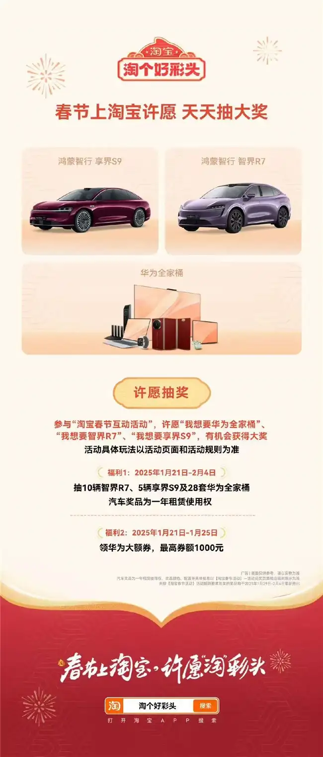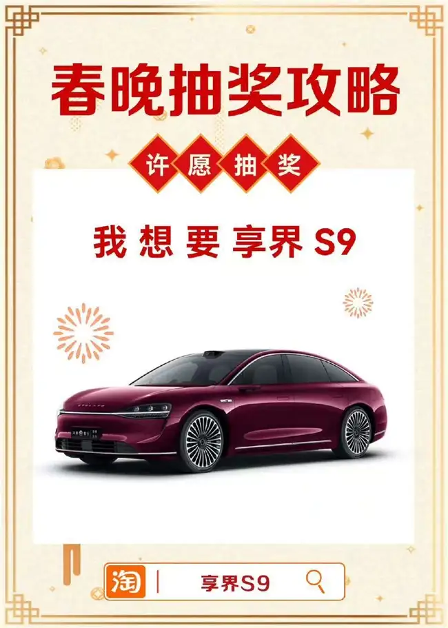 新年的钟声即将敲响,春节的欢乐氛围越来越浓。在这个充满喜悦与团圆的时刻,享界汽车的福利来咯!1 月 21 日至 2 月 4 日,上淘宝首页搜索 “享界 S9”,点击进入活动页面,参与互动页面的「放灯许愿」活动,每天都有开奖机会!活动期间取 5 位幸运用户,将有机会获得全景智慧旗舰轿车享界 S9 一年使用权。