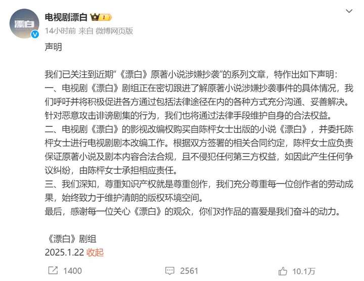 对于此事,电视剧《漂白》剧组发布声明,回应称:“剧组正在密切跟进了解原著小说涉嫌抄袭事件的具体情况,我们呼吁并将积极促进各方通过包括法律途径在内的各种方式充分沟通、妥善解决。”