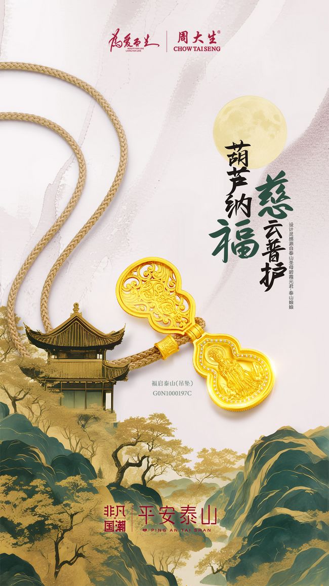 祈福文化自古以来便是华夏文明的重要组成部分,它宛若璀璨的星辰,引领人们在纷繁尘世中寻觅心灵慰藉;又似无形的桥梁,将过去、现在及未来紧密相连,为中华民族的生生不息持续注入精神力量。周大生珠宝深受这一精神力量的影响,并重磅打造了非凡国潮系列产品,借此传递“吉祥如意,越来越好”的美好祝福,愿佩戴之人能“多喜乐,长安宁,所想皆明,所行皆顺”。 福启泰山巍峨泰山屹立千年,是中华民族精神的象征,自古以来有着“泰山安,则天下安”的祥瑞说法。周大生跨界联名泰山风景名胜区,打造的非凡国潮·平安泰山系列提取泰山摩崖石刻、石敢当、碧霞元君(泰山娘娘)等特色元素,并结合黄金镶嵌等特色工艺,实现泰山平安文化与国潮美学的深度融合。“福启泰山”作为非凡国潮·平安泰山系列的最新力作,不仅外形设计极富特色,内在寓意同样深远。“福启泰山”的手工花丝工艺精妙典雅,六爪米镶工艺隽秀奢华。此外,“福启泰山”共同开合结构设计也内藏玄机,将泰山娘娘元素与葫芦造型相结合,独特有趣更有福。泰山娘娘慈光摄受众生,护佑平安健康;葫芦容纳绵绵福泽,寓意好运连绵。