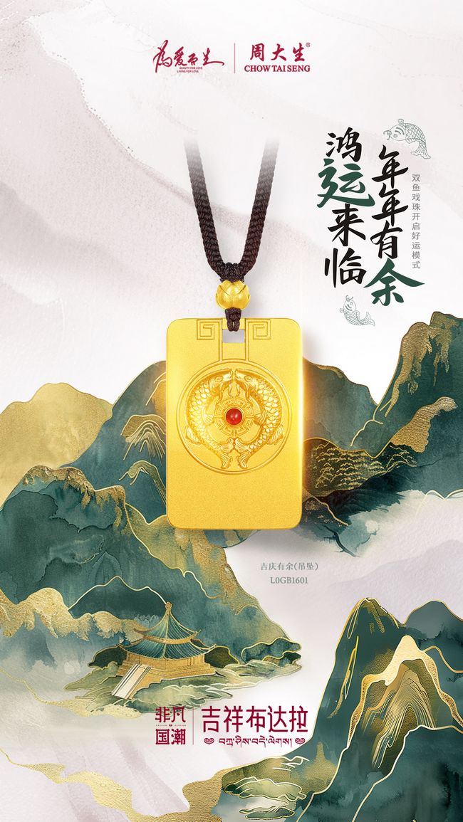 吉庆有余周大生非凡国潮·吉祥布达拉系列以“吉庆有余”送去“扎西德勒,越来越好”的祝福。宝鱼为吉祥八宝之一,象征着自在与活力,也象征着慧眼,双鱼则代表着双眼慈视众生。周大生采用古法金工艺錾刻“吉庆有余”的宝鱼形象,不仅造型立体而生动,还传递了如鱼得水,和美圆满的精神力量。宝鱼中心的红色珐琅更代表着代表吉庆,寓意风生水起,生机无限。