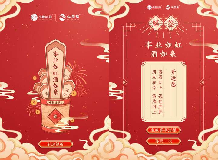 同时,心悠然还通过设计H5互动游戏#悠然开运签#,将传统祈福文化与数字化体验结合,用户参与抽取新年签语即可生成个性化祝福海报分享社交平台。这一活动,以轻娱乐形式降低用户参与门槛,利用裂变式传播扩大品牌曝光,实现品牌年轻化渗透;另一方面,通过签文内容巧妙融入产品特性,潜移默化传递品牌价值观。同时,以“好运”符号强化春节节点情绪价值,为消费者创造情感愉悦体验,最终形成用户自发传播的长尾效应,助力2025年品牌势能持续积累。