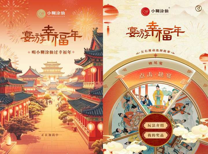 为吸引年轻群体,小糊涂仙推出H5互动游戏《宴游幸福年》,用户通过答题穿越“孔府宴”、“弥月宴”、“烧尾宴”与“曲江宴”等历史四大名宴场景,最终生成定制版“新年吉签”与祝福壁纸。活动巧妙融合趣味答题、国风插画等元素,分享后可解锁二次抽奖机会,并植入“百家齐宴”餐厅的桌卡二维码,实现“线上玩梗-线下引流-社交再传播”的闭环。