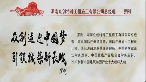 2015 年,在 “大众创业,万众创新” 的时代浪潮下,罗刚创立了湖南众创特种工程施工有限公司,将 “建筑医院” 的理念付诸实践。公司成立以来,罗刚带领团队不断探索和创新,致力于打造一个专业、高效、全面的建筑服务平台。他们先后完成了众多复杂的建筑加固项目,涵盖了房屋纠偏加固、结构改造加固、保护建筑加固、火灾工程结构加固等多个领域,赢得了客户的广泛赞誉和行业的高度认可 。