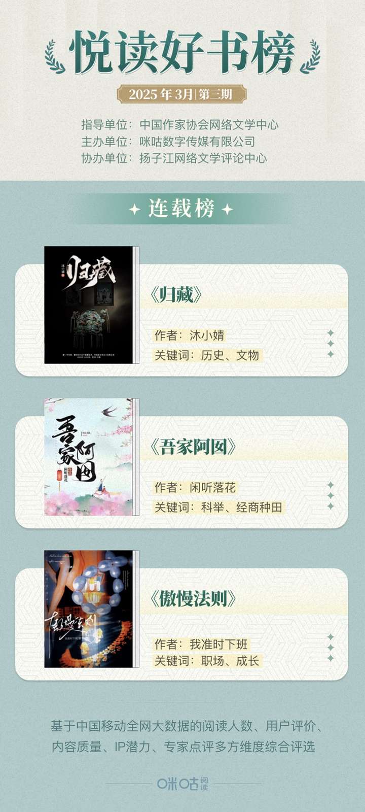 3月15日,由中国作家协会网络文学中心指导,咪咕数字传媒有限公司主办、扬子江网络文学评论中心协办的“悦读好书榜”活动发布了第三期榜单。本期榜单延续设置了“悦读新书榜”“悦读连载榜”“悦读完结榜”三个子榜,基于中国移动大数据分析与权威专家评审,遴选出兼具市场热度与文学价值的优质作品。南京师范大学文学院教授、博士生导师李玮,山东大学文学院院长、山东作协主席黄发有,北京大学中文系教授、文学讲习所副所长邵燕君三位资深评论家作为本期评审专家,从文学性、创新性与社会价值维度对上榜作品进行了专业点评与解读。