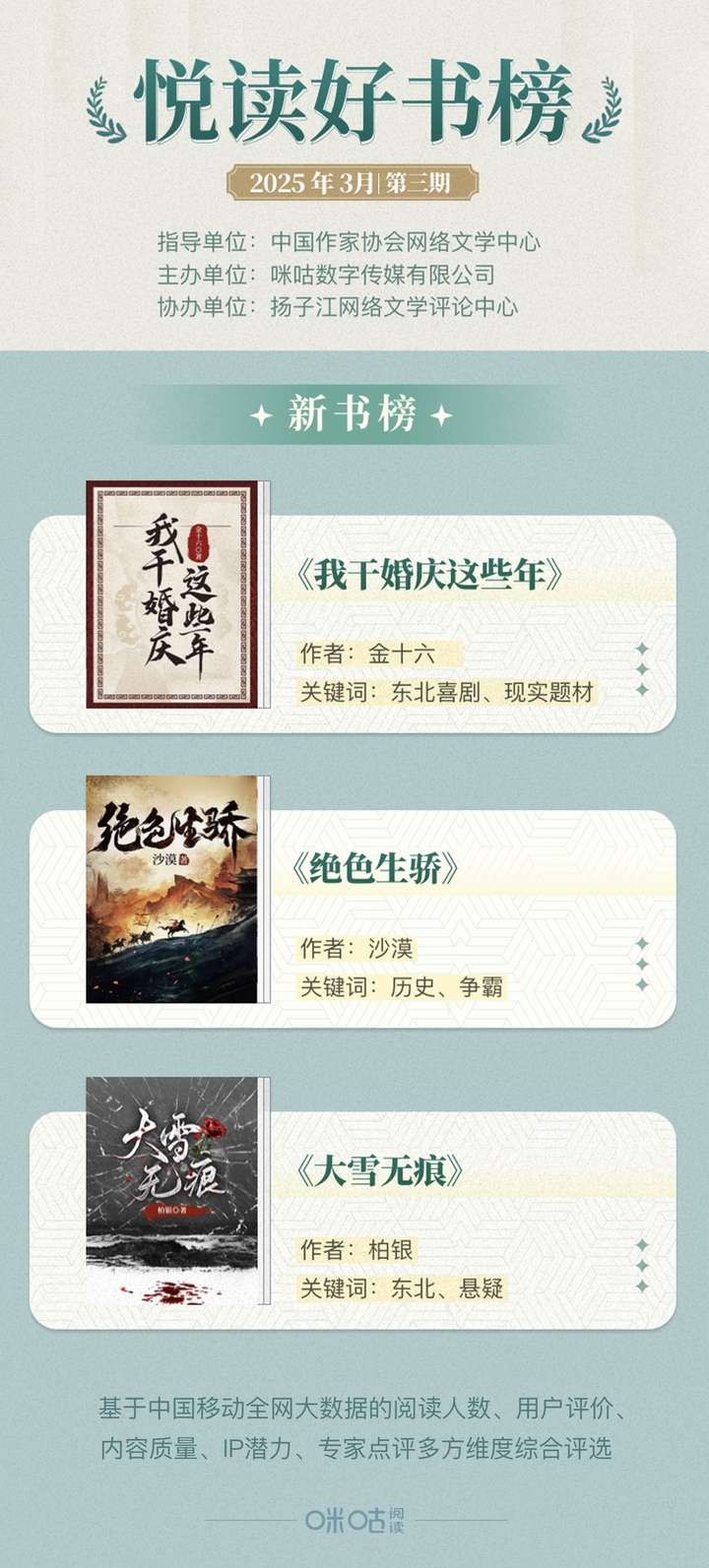 《我干婚庆这些年》《绝色生骄》《大雪无痕》凭借对现实与历史题材的创新探索及独特的地域文化表达入选本期“悦读新书榜”。咪咕爆款作者金十六深耕都市职业文,新作《我干婚庆这些年》延续其《后顾无忧》(第七届咪咕杯金奖作品)的现实关怀与幽默文风,扎根东北市井烟火,以婚庆行业为舞台,串起人生百态与家庭羁绊。历史小说作者沙漠的《绝色生骄》以架空历史为背景,以苍劲有力的笔触勾勒出一幅乱世群像图卷。青年作家、编剧柏银的悬疑力作《大雪无痕》同样聚焦东北小镇,以法医特有的冷峻视角切入叙事,建构了一场跨越二十年光阴的悬疑迷局。