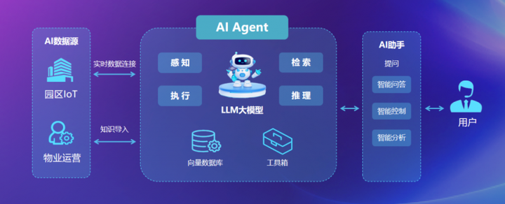 图:达实AIoT平台V7版本AI Agent服务框架。其中,园区接入实时数据的应用为达实智能行业首创