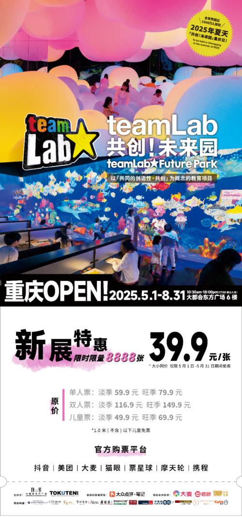 全球观展超1500万人次,由国际跨域艺术团队teamLab打造,全球知名的体验型互动展览,teamLab共创!未来园登陆重庆!即将于5月1日正式在重庆大都会东方广场开幕,新展特惠早鸟票现重磅限量发售!