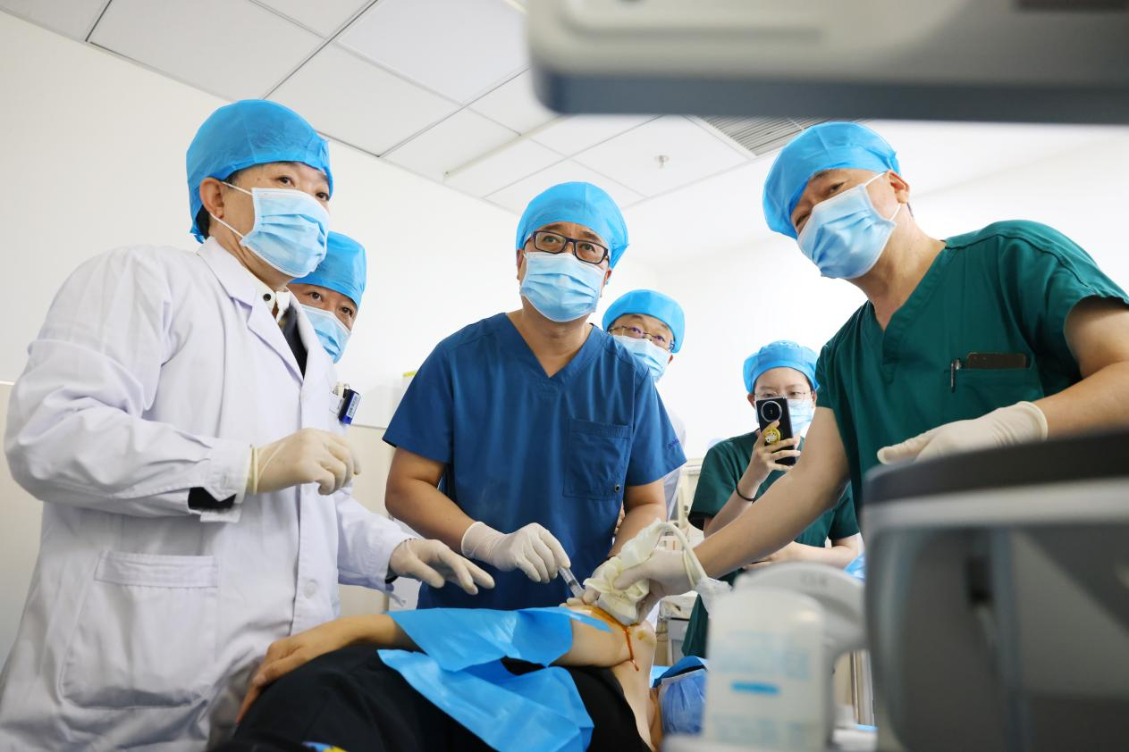 疼痛科手术室郭瑞君教授团队、王利刚主任等在为患者做超声引导下精准治疗手术