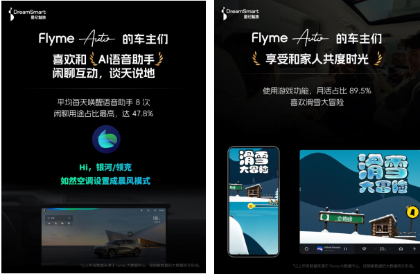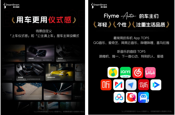 Flyme Auto 用户年轻、个性,注重仪式感,体贴另一半,“上车仪式感”和“公主请上车”是他们的常设模式;QQ音乐、爱奇艺、网易云音乐、哔哩哔哩、喜马拉雅是最常用的 5 款 App;《跳楼机》《唯一》《下一首心动》《特别的人》《爱错》是他们最常听的歌曲;他们喜欢和 AI 语音助手互动,闲聊占比达到 47.8%,还会用车机玩“滑雪大冒险”等亲子游戏。