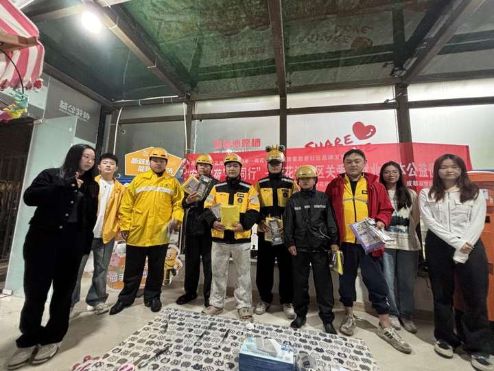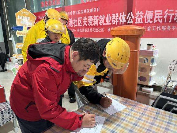 为深入关爱新就业群体,提升外卖骑手等户外工作者的交通安全意识,同时倾听其对社区治理的宝贵意见,2025 年 4 月 29 日上午,荷花池街道荷花池社区携手成都家悦社会工作服务中心,在荷花池社区党群服务中心楼下站点成功开展了 “安全‘荷’你同行”——荷花池社区关爱新就业群体公益便民行动。