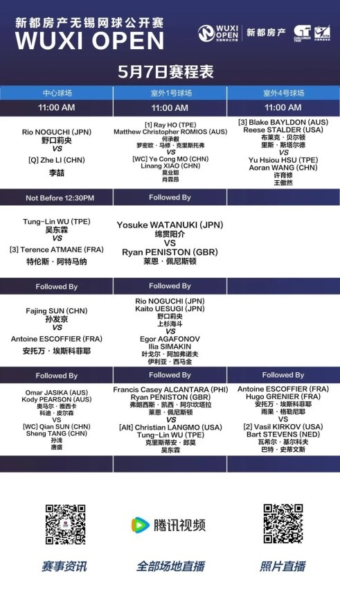 在5月7日的赛程安排中,李喆在中心球场首个登场,迎战日本球员野口莉央,冲击男单八强席位。特伦斯·阿特马纳与中国台北球员吴东霖的对决在第二场打响。中国选手孙发京在第三场亮相,对阵法国选手安托万·埃斯科菲耶(Antoine Escoffier)。江苏省网球队的两位球员孙浅、唐盛压轴出战,对阵奥马尔·雅西卡(Omar Jasika)/科迪·皮尔森(Kody Pearson)。