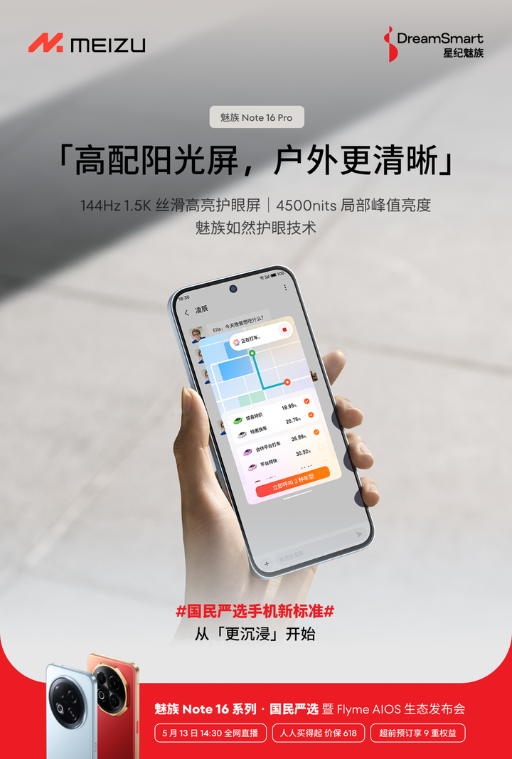国民严选魅族 Note 16 系列手机,即将在 5 月 13 日战神归来,同期登场的还有备受瞩目的 Flyme AIOS 2。最新爆料显示,魅族 Note 16 系列凭借超强续航能力和过硬的屏幕素质,书写了国民严选手机的新标准。其中魅族 Note 16 Pro 更是得到京东外卖骑手的青睐,荣获 “京东骑手推荐用机”的殊荣。