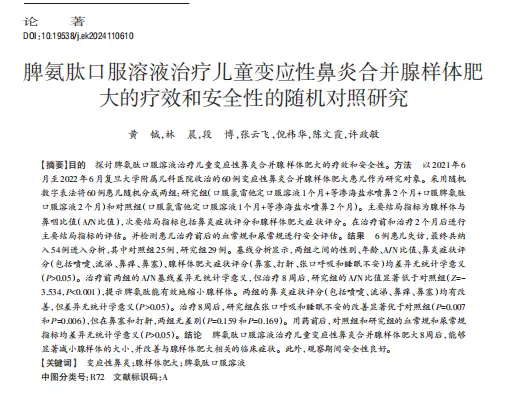 以许政敏教授及其团队发起的京生·脾氨肽口服溶液治疗过敏性鼻炎合并腺样体肥大的疗效和安全性的随机对照研究为例。该研究使用随机对照的方式,将参与研究的过敏性鼻炎合并腺样体肥大的患儿分为两组,其中一组患儿联合京生·脾氨肽口服溶液进行治疗。研究结果显示,双向免疫调节剂京生·脾氨肽口服溶液可以显著缩小患儿腺样体,明显改善鼻塞、打喷嚏、流鼻涕、张口呼吸、睡眠障碍等症状。同时,在研究期间,并无不良反应发生,其具有良好的安全性。
