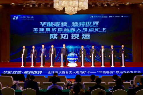 现场,杨东升与政府、协会、创新联合体成员单位等十位领导嘉宾共同按下“启动键”——标志着全球首次百台无人电动矿卡“华能睿驰”正式投运。