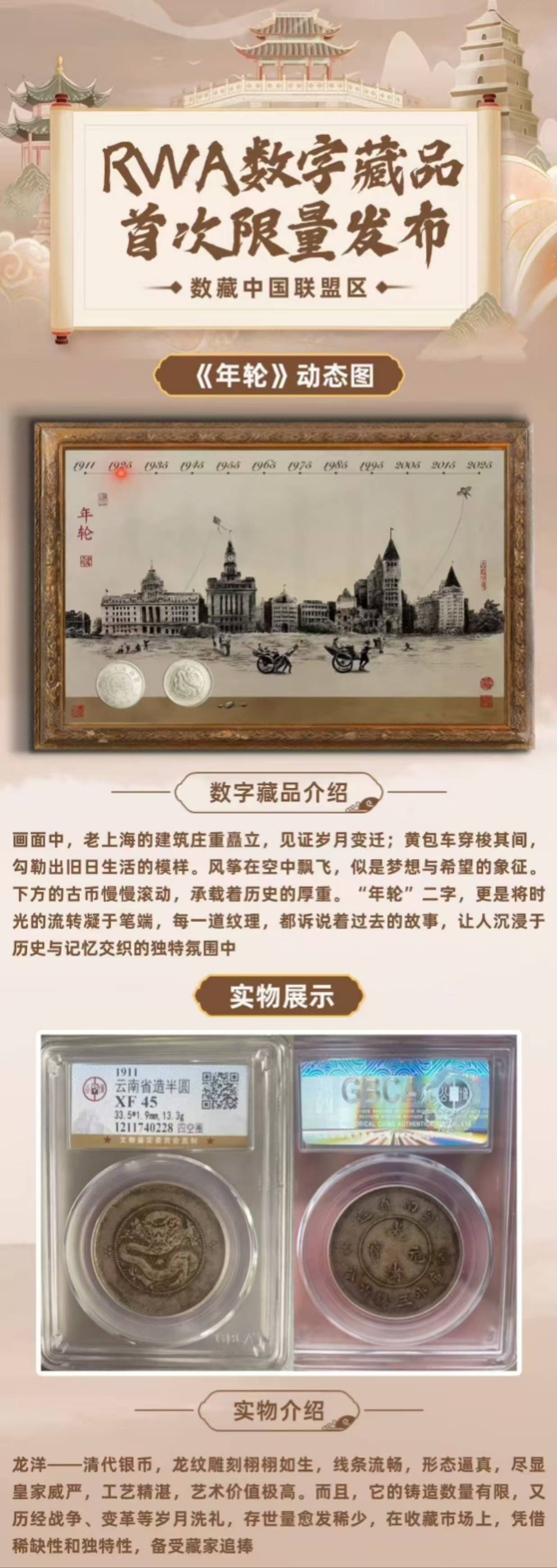 5月22日,中国领先的数字藏品发行与交易平台数藏中国宣布,将于5月28日正式推出中国首款可兑换实体龙洋的RWA(Real World Asset Tokenization,真实世界资产通证化)数字藏品——“年轮·动态图”。该藏品以清代银币“龙洋”为实物锚定资产,开创了数字藏品与历史文物深度融合的新模式,标志着数藏中国在赋能实体经济与文化遗产数字化领域再进一步。