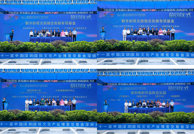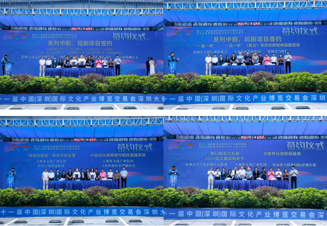 文博会重在交易,本届大视界分会场签约项目再创新高,预计项目签约总额突破15亿元人民币。包括数字影视文旅融合发展专项基金(数字影视文旅融合发展专项基金项目是大视界集团2025年战略布局的重头戏,计划首批募集资金2亿元人民币,全年度循环滚动募集总额10亿元,5年内募集总额将达到100亿元人民币。首年将扶持中剧、短剧影视制片、发行及上下游产业公司300家以上,三年内扶持1000家以上。投资演唱会及大型文旅赛事30场以上)、“中国国际动作电影总部基地(湾区艺术中心)”(该项目筹备长达5年之久,本次文博会上终于尘埃落定,大视界集团与央企中交集团成功签约)。中国国际动作电影总部基地(湾区文化艺术中心)定位于全球动作电影全产业链第一平台。是深圳市宝安区人民政府力推的首例以BOT模式特批给大视界文化产业公司作为样板工程打造的重点影视文化项目。该项目总占地面积约4337平方米,建筑面积约40000平方米,该项目的落地运营必将成为粤港澳大湾区一张最闪亮的文化名片)、“张家界仙界里国际明星旅居度假村”(该项目由马来西亚前首富郭鹤年事务代理人、澳大利亚爱国华侨刘成龙先生亲自上台与大视界集团董事长吴啸签约)、“短剧出海计划”(由BIGO平台在156个国家同步播出)、“AI影视剧制作中心”项目、“环球大剧场”平台联合开发运营项目、“AI自动化视频制作矩阵直播系统”“第62届亚太影展2025亚太国际电影节”、张家界大峰林仙侠影视基地项目、影视AI大模型开发及电影《最后25天》《担干山》《拍卖师》《千帆梦2》“一县一剧”“一品一剧”等百部新媒体短剧项目。